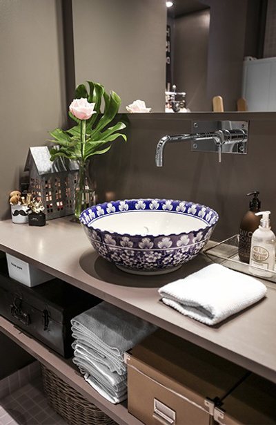 El contrapunto de este aseo lo introduce el lavabo, un modelo de apoyo que suma un encantador motivo floral. Este elemento es el encargado de añadir un toque de color más una forma orgánica y dinamismo a la decoración de un baño actual.