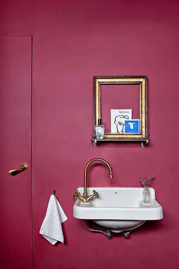 La pared pintada en un cálido color morado y que se extiende hacia la puerta, le da una acertada uniformidad al ambiente. Es una idea que podemos llevar a cualquier otra habitación de la casa. Incluso se ha prescindido del uso de marcos o contramarcos para la puerta, lo que quita peso visual al conjunto, pues la mayor atracción está puesta en el tono intenso de la pintura del muro.