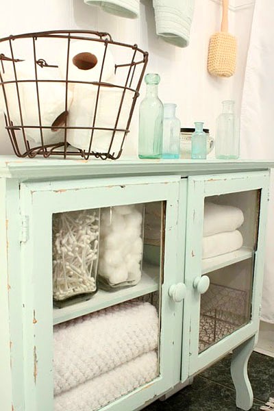 Las toallas, rollos de papel higiénico también necesitan un lugar de guardado en un cuarto de baño. Integra baldas o estanterías que se puedan adecuar a rincones no aprovechados. O incluso, si hace falta un nuevo mueble, apuesta a recuperar una vieja pieza de mobiliario.