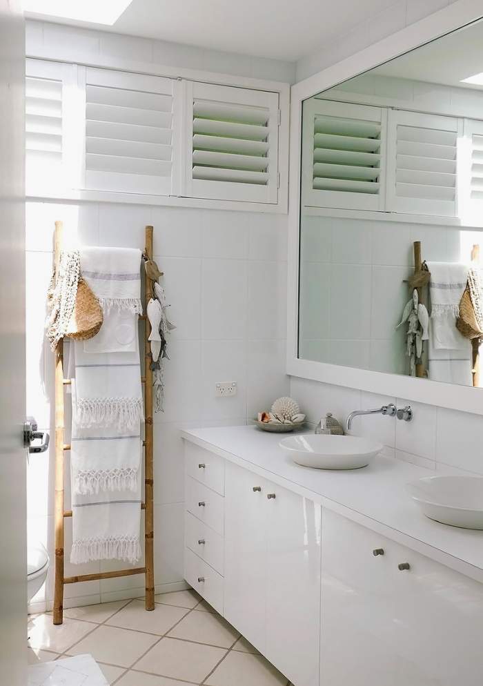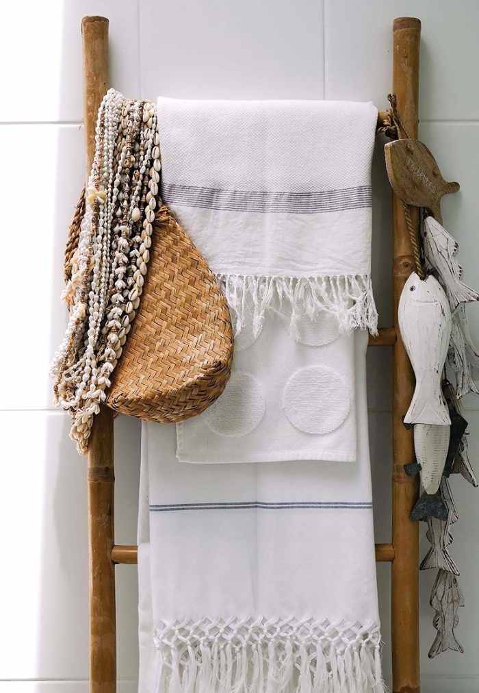 Una escalera diseñada con cañas reemplaza un toallero, es a la vez un objeto de gran valor estético, en ella se reúnen textiles de tejidos naturales, que aportan más texturas, mientras el remate se consigue con unas guirnaldas con peces de madera y collares de caracolas. Otro arreglo similar se introdujo en una esquina del lavabo, donde un cuenco alberga también conchas de mar y caracolas por ejemplo.