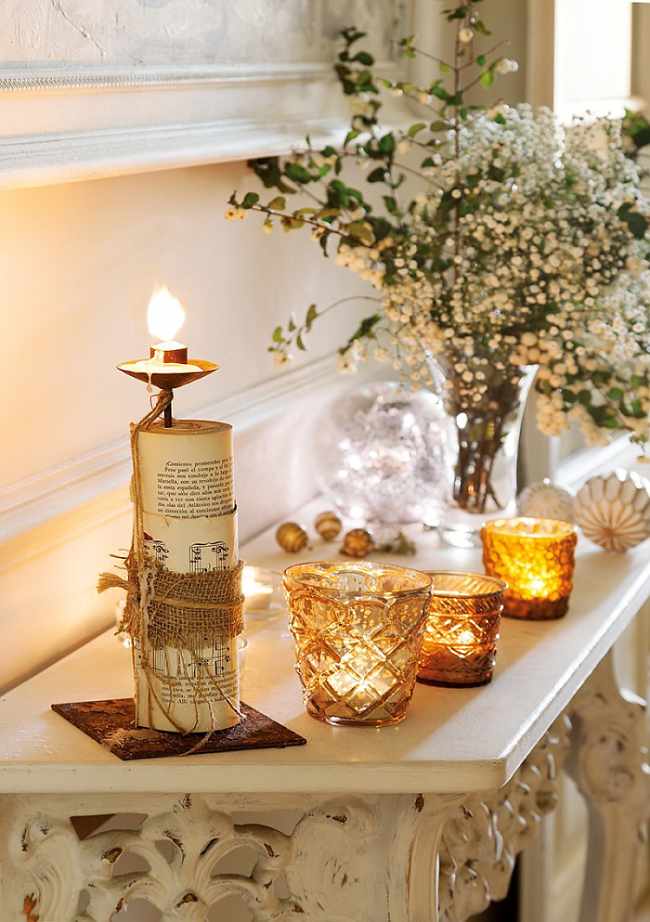 Para hacerlo se han utilizado unas viejas hojas de libros, periódicos o pueden ser partituras, con ellas se envuelve el pie del candelabro o portavelas, se suma un retal de tela de saco y con una cuerda de hilo sisal u otro de fibra natural, se sostiene el arreglo.