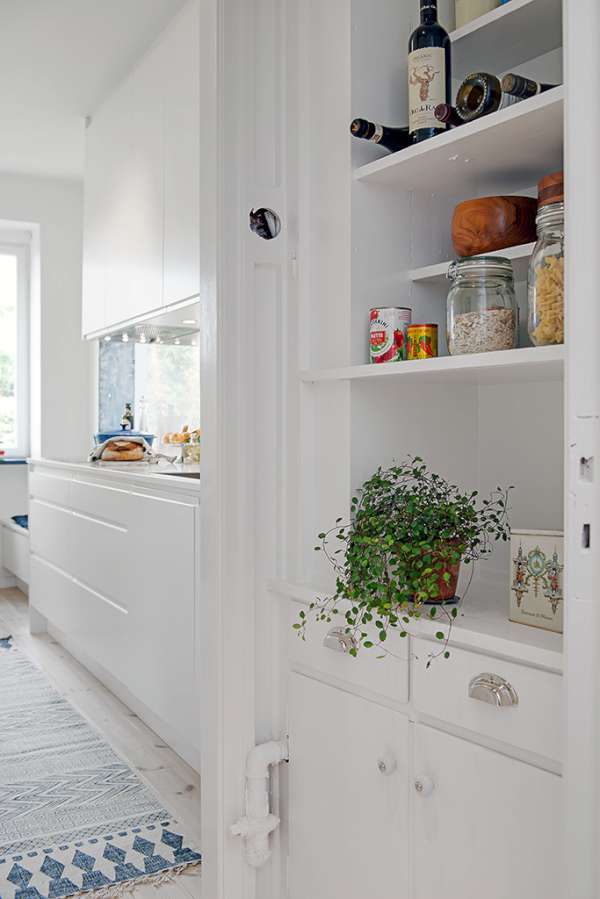 Los suelos de madera en espiga son el común denominador en las zonas de día, y en otras habitaciones es el material que continua presente, incluso en el pavimento que se utilizó para sumar calidez a la pequeña terraza. Predominan las paredes blancas, que junto al mobiliario que sigue la misma línea, crean ambientes tan luminosos como delicados.