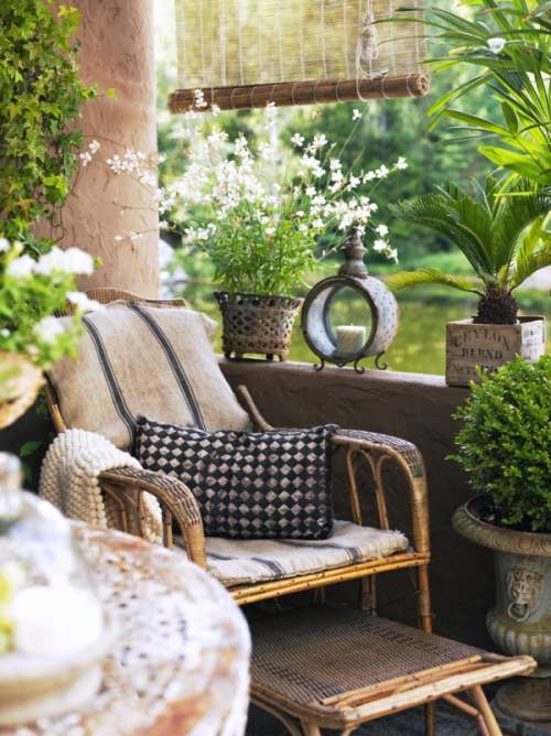 La fusión de materiales y de estilos se vislumbra desde las zonas de estar al aire libre, en las que se reúnen muebles de exterior de caña con otros modelos de forja, y vestidos con colchonetas y cojines, más piezas de arte que crean rincones atractivos.