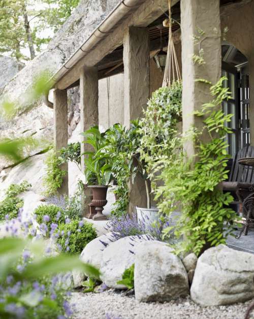 La vivienda recibe con un bonito jardín, rodeado por un cerco de piedras que se funden con los colores del paisaje, y una reja se abre para dar la bienvenida. El entorno natural que ofrece el bosque se extiende hacia el patio en las múltiples macetas que adornan la casa.