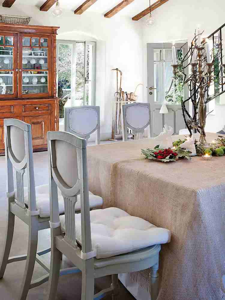 El interior ambientado para recibir la Navidad, ofrece una decoración que armoniza con la serenidad del entorno y el aire de campo. La carpintería con diferentes diseños, entre ellos ventanas de medio punto, se reparten en cada estancia y permiten que la luz se cuele, además que regalan amplias vistas del exterior.