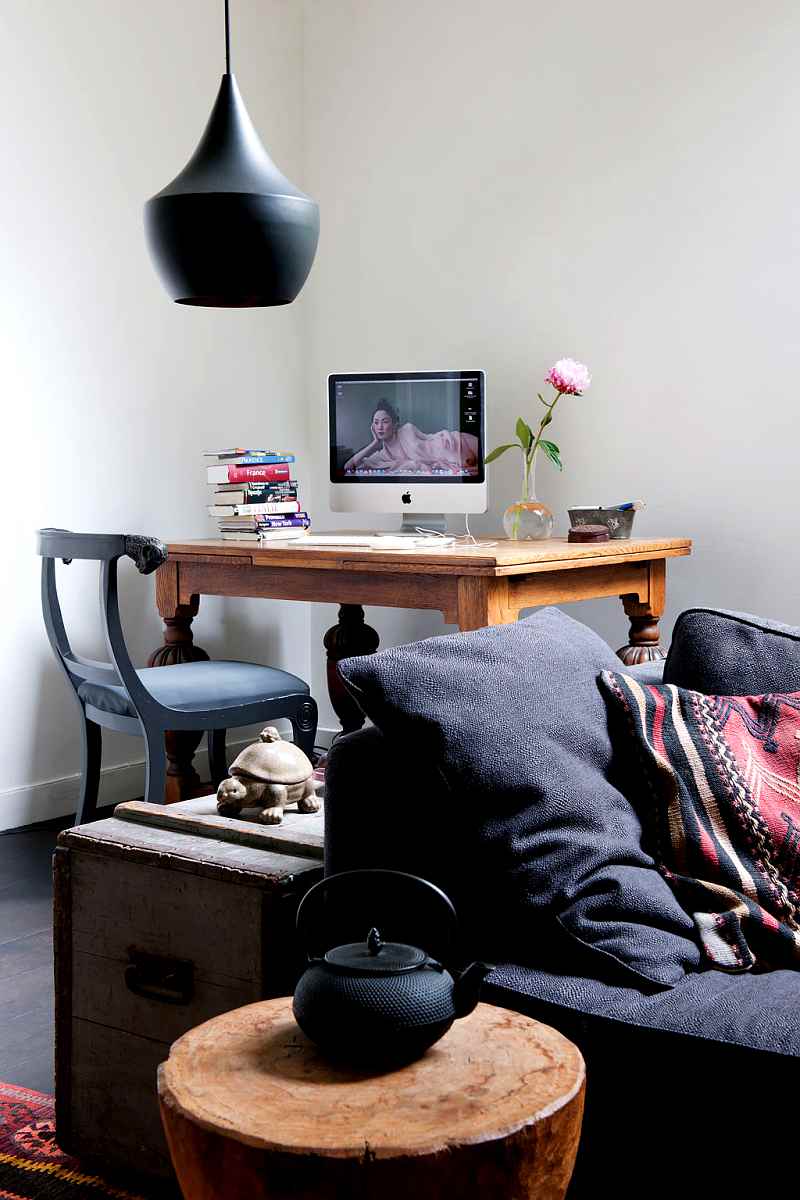 Una de las estancias que me parecen más atractivas es la zona de estar. Allí conviven un amplio sillón que con su tapicería oscura permite que la presencia de unos coloridos cojines se destaque, a su lado un antiguo arcón sirve como mesilla auxiliar y es un elemento con un fuerte carácter decorativo.