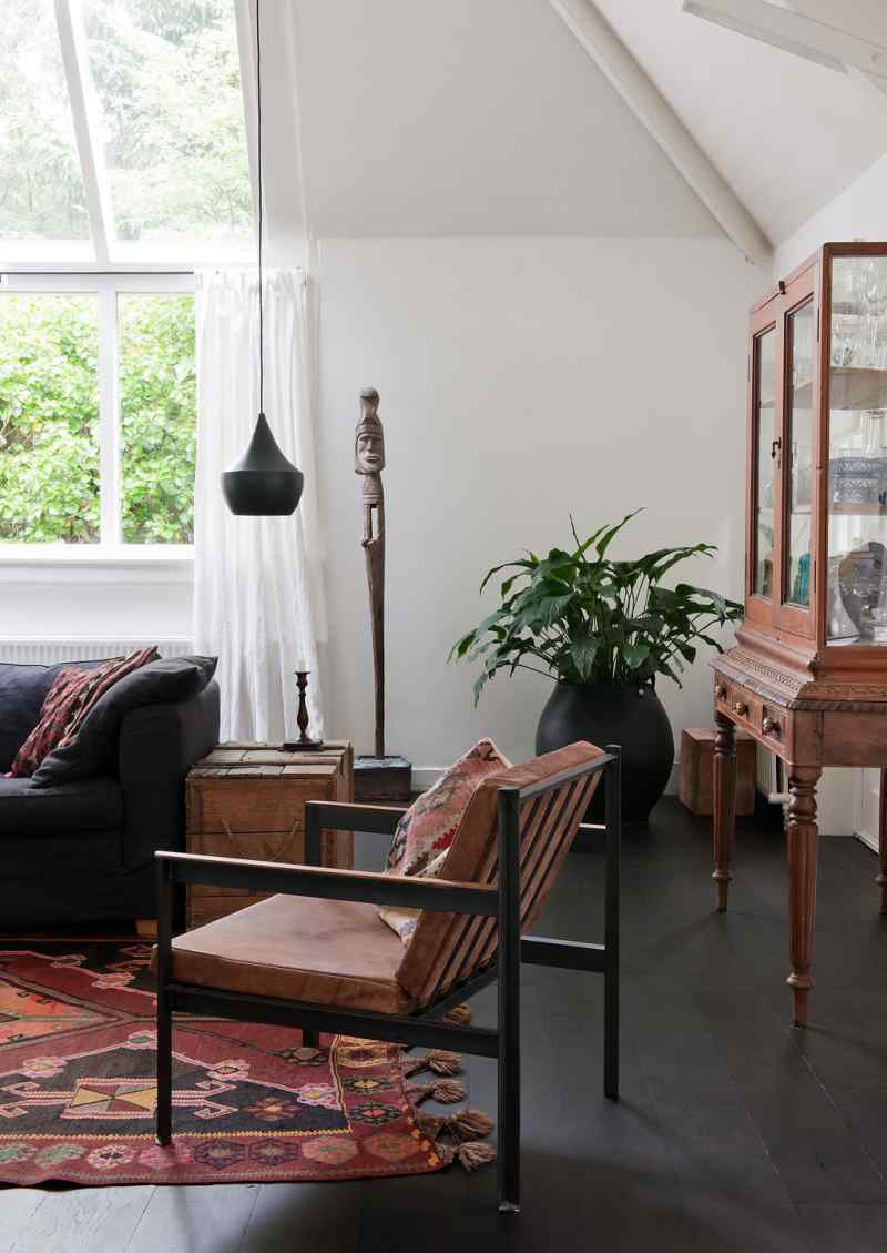La madera de los muebles es el material con mayor peso visual, se han elegido piezas diferentes, creando una estética ecléctica. Los accesorios decorativos, obras de arte, incluso una lámpara diseño de Tom Dixon y unas generosas macetas con plantas dotan de personalidad esta habitación.