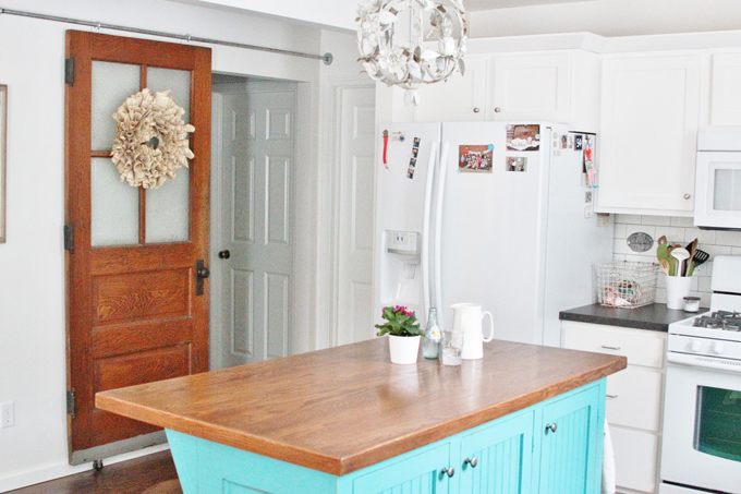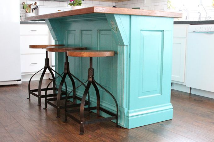 La tabla de madera junto al acabado turquesa de esta pieza la convierten en un punto focal de la cocina, que con unos taburetes de estilo industrial completan un conjunto tan bonito como funcional.