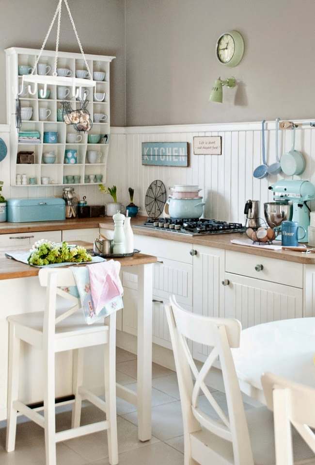 La cocina es un delicioso espacio, en el que se han combinado unas pinceladas de color que crean una atmósfera delicada. Toques de verde mint, azul claro y rosa en tonos empolvados, se aplicaron a los detalles decorativos y a los accesorios que completan el menaje de esta cocina práctica. Incluso una batidora KitcenAid se comporta como un detalle decorativo más.