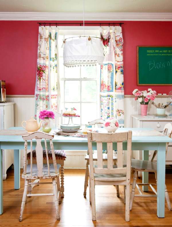 Una mesa pintada en un azul claro pastel, rodeada por un conjunto de sillas de diferentes diseños que tienen en común el blanco desgatado de su acabado, conforman el principal mobiliario de este comedor de diario, y los detalles completan una atmósfera adorable, como la cortina con un patrón que emula unos pañuelos antiguos, encargada de sumar colorido y textura a la decoración.