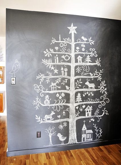 Decorar, ahorrar y sin restar espacio en una estancia el árbol de Navidad puede estar dentro de tu casa, aprovechando la presencia de una pared pintada con pintura de pizarra conseguirás un efecto sumamente atractivo. Dibuja el modelo que más te guste y suma los accesorios que se te ocurran, es una opción perfecta para divertirse.