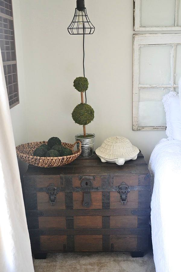 Las mesitas de noche se han escogido modelos desiguales, y se encargan de sumar un guiño vintage sin dejar de lado la funcionalidad, ofreciendo espacio de almacenaje y una superficie de apoyo. En este caso se eligió una mesa de forma redonda pequeña y baja y un antiguo baúl, que reemplazan las convencionales mesillas.