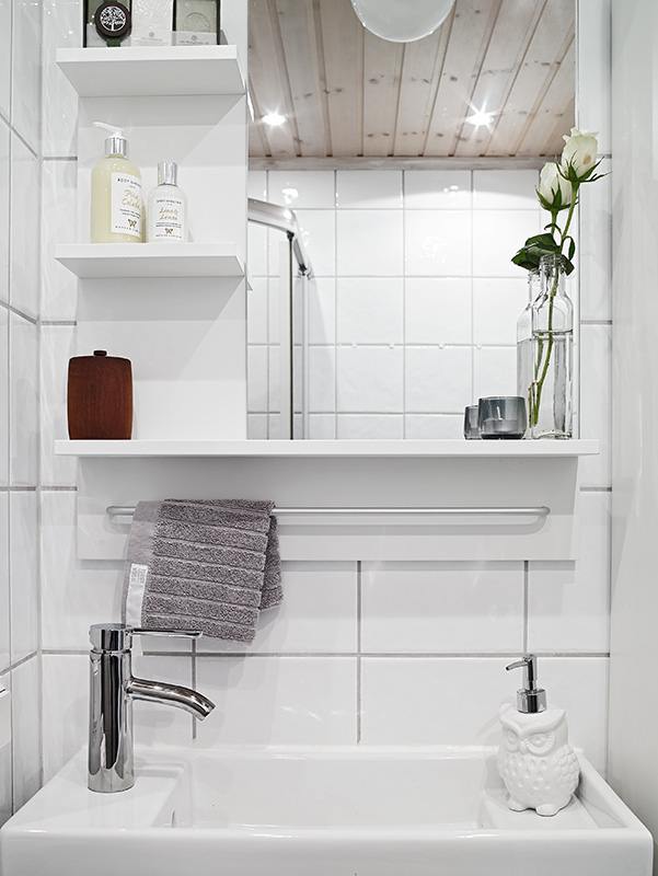 Un lavamanos con una pequeña encimera, situado en la esquina del cuarto de baño, es una idea que encaja a la perfección con una estancia estrecha, o para integrar un aseo a un dormitorio, sin generar incomodidades, ni pasos dificultosos.