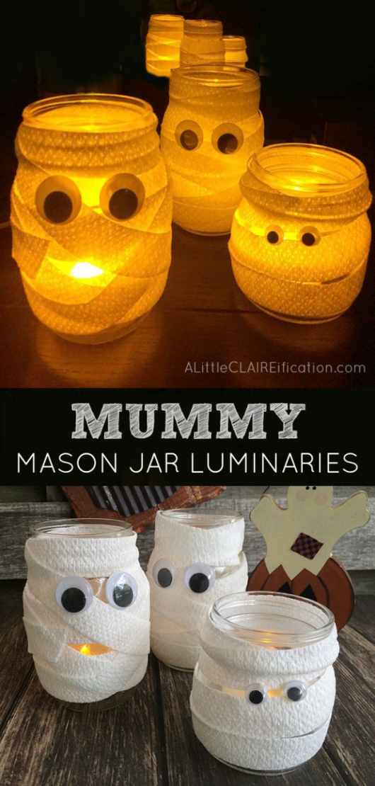3. Una de las manualidades de Halloween que más me gustaría hacer, pues creo es muy decorativa. Se trata de unos farolillos muy simpáticos que emulan ser unas pequeñas momias. Para hacerlos se necesitan unos frascos o tiestos de cristal en cuyo interior pondremos unas pequeñas velas de té. Pero previamente se los rodea con gasa o vendas para empezar a formar la figura de las “momias”, unos ojitos serán el toque final, y ya estarán listas para iluminar y atraer las miradas.