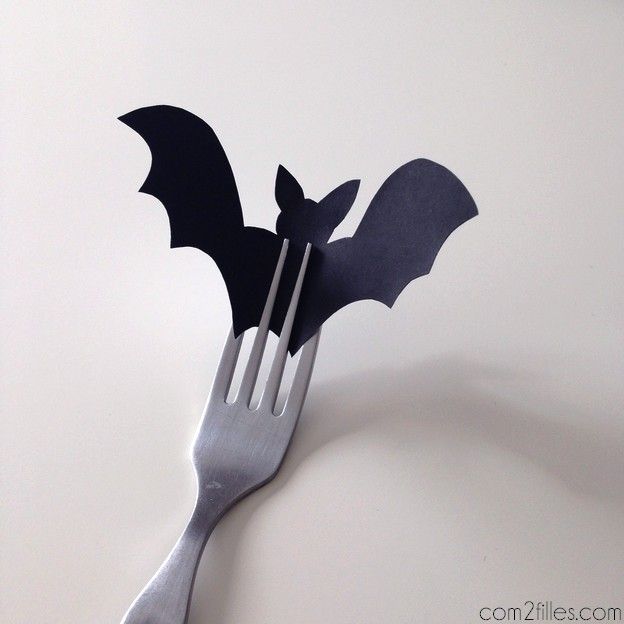 4. El último es un proyecto súper fácil e ideal para decorar una mesa. Se trata de la figura de unos minúsculos murciélagos recordados sobre cartón negro, que se pueden sujetar a los tenedores. Con ellos lograrás añadir un toque diferente a una cena este próximo Halloween.