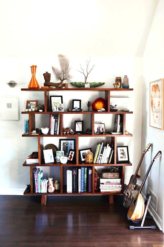 Una estantería puede robarse las miradas si está construida en un material particular, o bien pintada en colores intensos, o también por el tipo de distribución que tengan los estantes. Podemos encontrar algunas que tienen los estantes inclinados y sobre ellos se apoyan con simpatía libros y revistas. Las divisiones irregulares de una librería aportan un toque inesperado y sobre todo ritmo y dinámica a las paredes, decorándolas con mucho carácter.