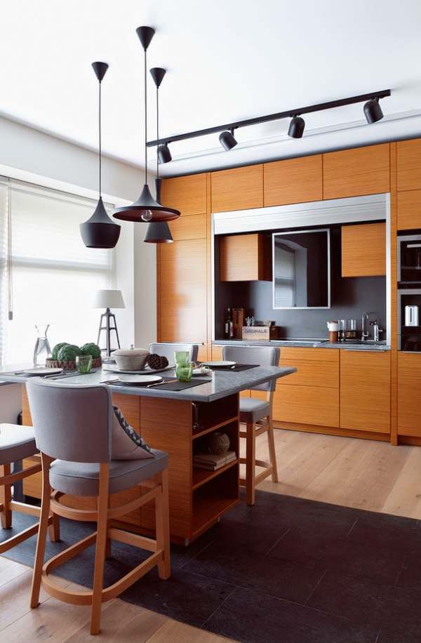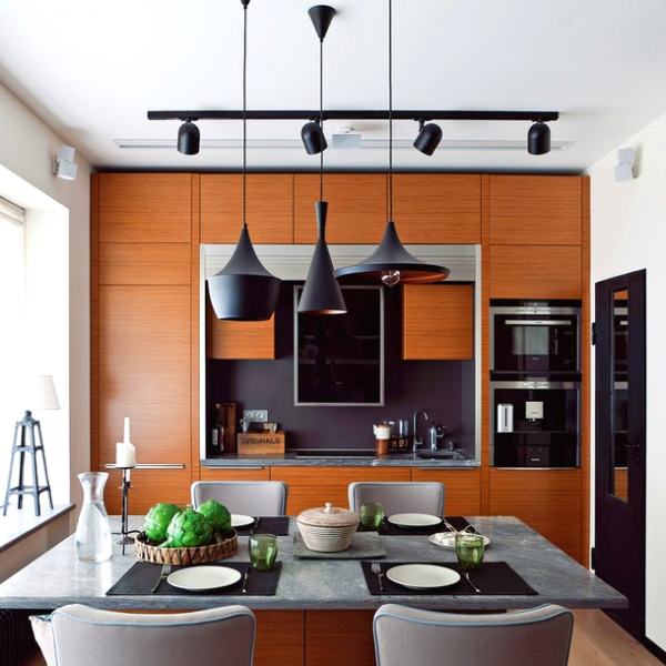 En este ambiente en el que se integra la cocina con el comedor y la madera es el material que predomina, aportando absoluta calidez y elegancia a la decoración, la iluminación se corona con unas luminarias de diseño, modelos que aportan un guiño de estilo, a la vez que funcionalidad y confort a la zona del office.