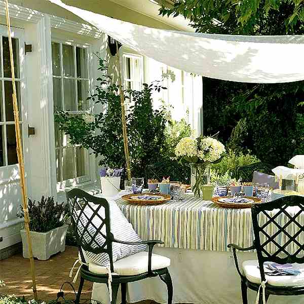 Las telas superpuestas son texturas, acabados y colorido para la mesa, los banderines que se despliegan en altura, los toldos y pérgolas improvisadas, faroles con velas para la noche, cintas y moñas que decoran los respaldos de las sillas, una maceta con una bonita planta, son otras ideas que podrás implementar para mesas en verano.